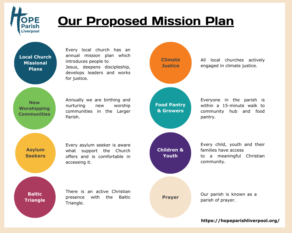 Hope Parish Liverpool will nurture a diverse range of theological, ecclesiological, liturgical, and missional practices, uniting clergy and lay leaders in service to God and the community. Through collaboration, we will build a stronger, more connected parish that actively engages with local needs.
